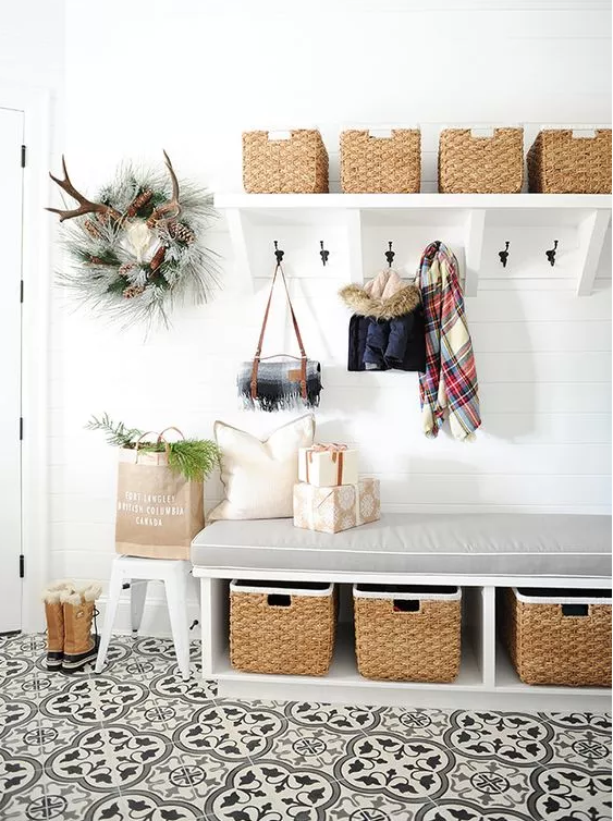 如果家里常住的人数不多的话,更建议只装隔板架,其它的比如板凳或挂钩就不要布置了,直接留白,这样既可以保持空间的通透,整个空间的视觉也会有扩充的效果。