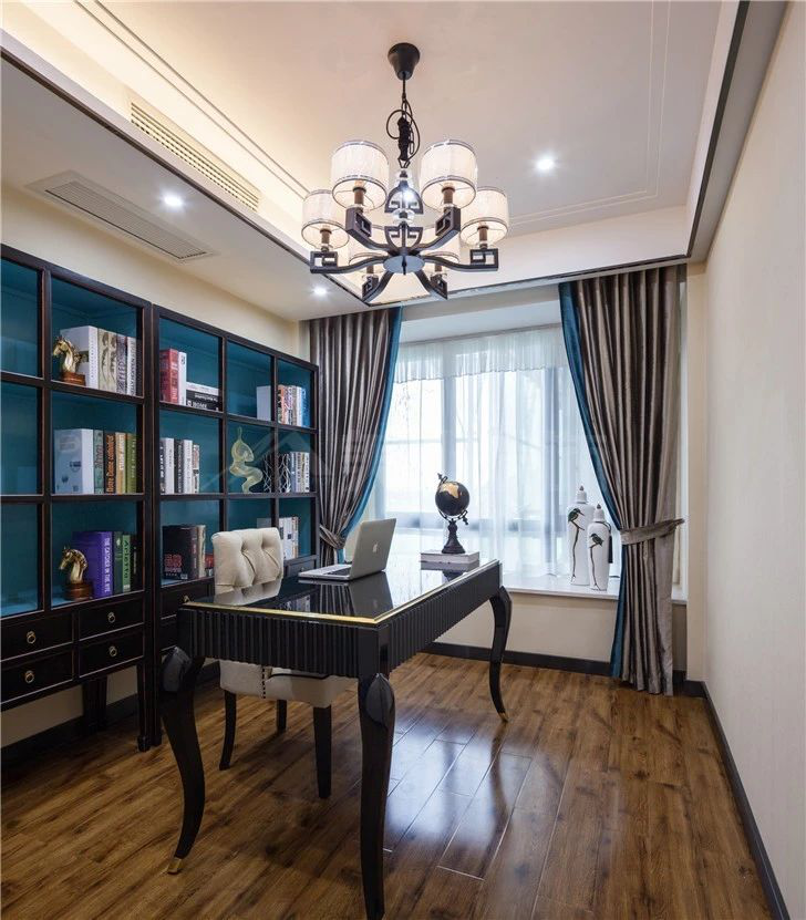 虽说书房的装修风格需要与房屋的整体装修风格相似,但是也要考虑到书房的功能性,应该展现比较雅致、清幽的风格效果。此外,书房的颜色要柔和,使人平静,最好以冷色为主,如蓝、绿、灰紫等,尽量避免跳跃和对比的颜色。