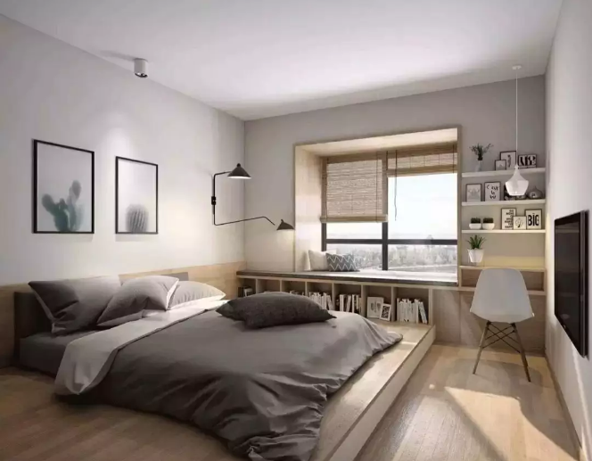 如果卧室位置不够,也不需要大量的收纳,可以从窗户底部入手,因为飘窗的底部也是一个很好的收纳区,放一些小箱子,小柜体也十分合适,不仅可以收纳物品,还可躺可卧,是一个不可多得的休闲角落。
