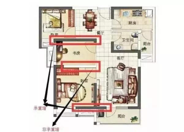 4、通过部位判断:外墙通常都是承重墙,和邻居共用的墙也是。一般的非承重墙在卫生间、储藏间、厨房及过道。