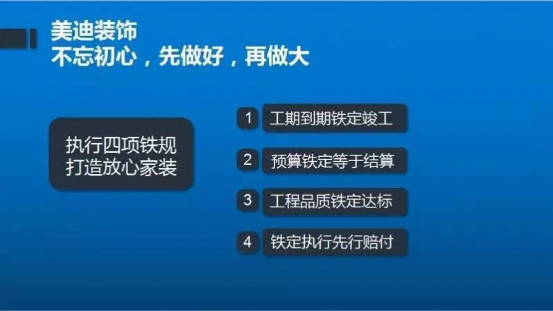 木工在装修中占比很大的,家装木工施工工艺的好坏直接影响到家装质量及正常的使用寿命。所以说,在装修时你需要选择一个严格保证质量与施工品质的公司至关重要。美迪装饰,放心家装,四项铁规(工期到期铁定竣工、预算铁定等于结算、工程品质铁定达标、铁定执行先行赔付),我们一直都在做放心家装这件事,把消费者对家装的‘担心’变成‘放心’。