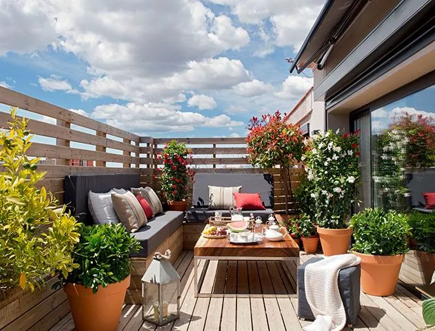 在露台上安装棚架也是不错的选择,有保护私密、遮风挡雨、为植物提供生长空间的作用。安装时需考虑其抗风稳固性。