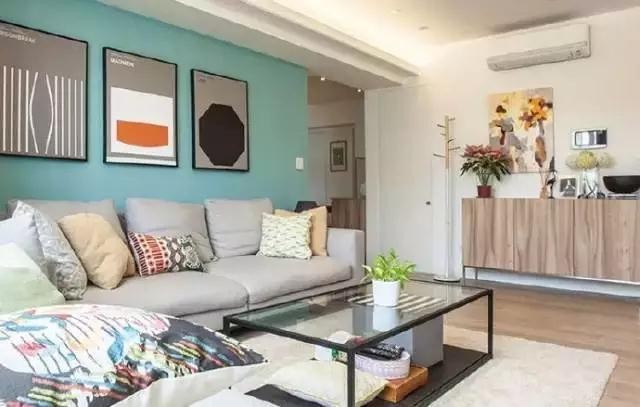 蓝色背景墙+蓝色沙发营造视觉的统一性。