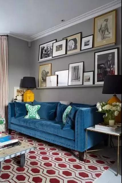 浅蓝背景墙+浅灰色沙发+照片墙,艺术氛围极其凸显。