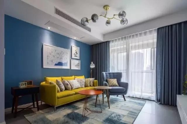 蓝色背景墙+亮黄沙发让空间主次分明。