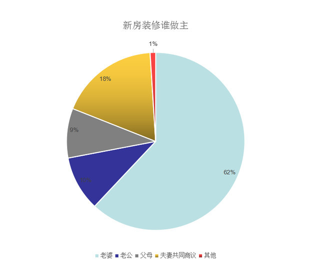 根据调查结果显示,超过60%的家庭在装修的时候由老婆做主,18%的家庭选择夫妻共同商议,9%的家庭选择听父母的意见。