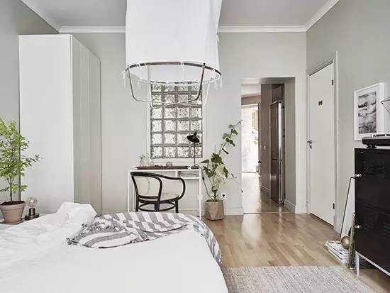 主卧空间没有门,与客厅是相通的,让空气在屋内更好地流通。墙面、家具、床品的色彩是最典型最纯朴的简洁北欧风。墙面的小工作台让空间功能更加丰富,背景墙使用了与玄关相同的设计。