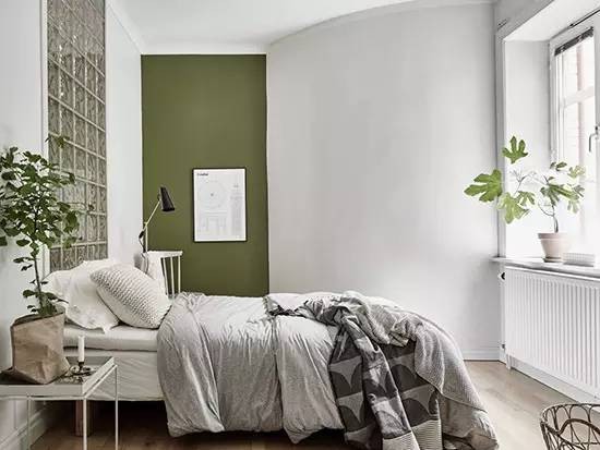 次卧空间不大却也体现出与整体家居风格的协调性。床头背景墙仍然是马赛克拼贴,一个小小的设计元素遍及了家中的每个角落。深绿色的墙面赶走了单一色调的乏味,床头柜上的一株绿色植物用纸袋做花盆,也是个朴实的生活细节。