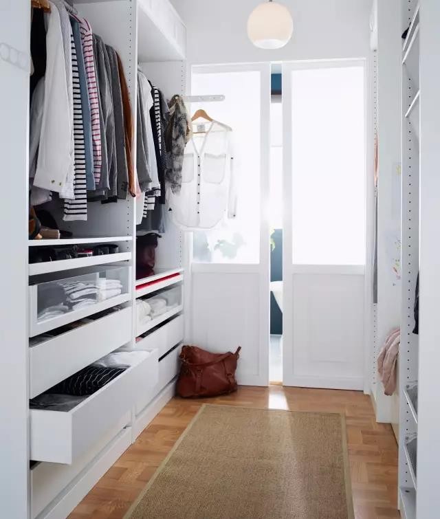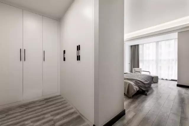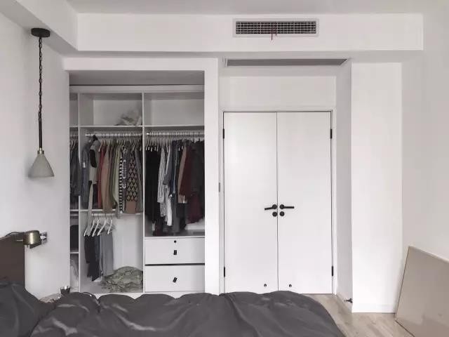 卧室里某一面墙较大的,可以把它利用起来装成一整面的衣帽间,甚至可以通过开放式的挂钩等形式,来实现自己梦寐以求的衣帽间小梦想。