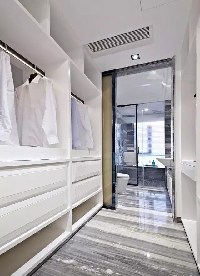 主卫的通道,甚至是卫生间原本的干区,都可以改造利用起来,把主卫门外的两侧装成步入式衣帽间,这样利用也是不错的选择。