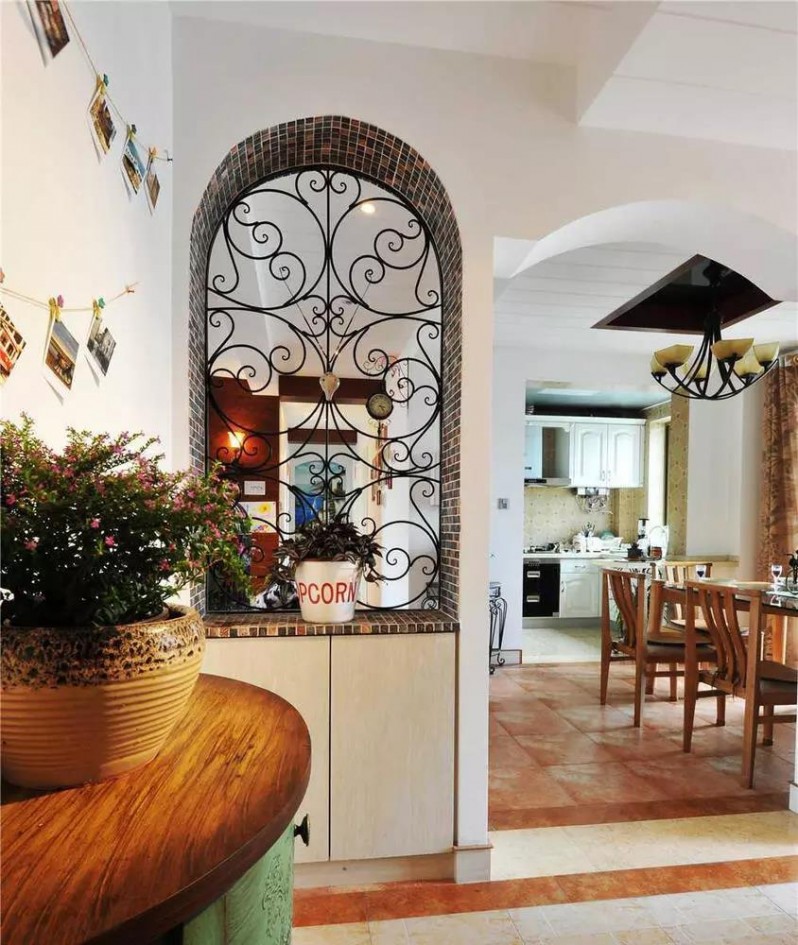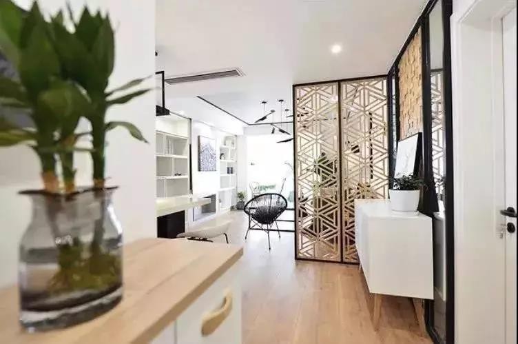 最直接的方式便是在玄关竖一道镂空的墙,稍微做一些造型美化,若隐若现,美观的同时不影响屋内采光。