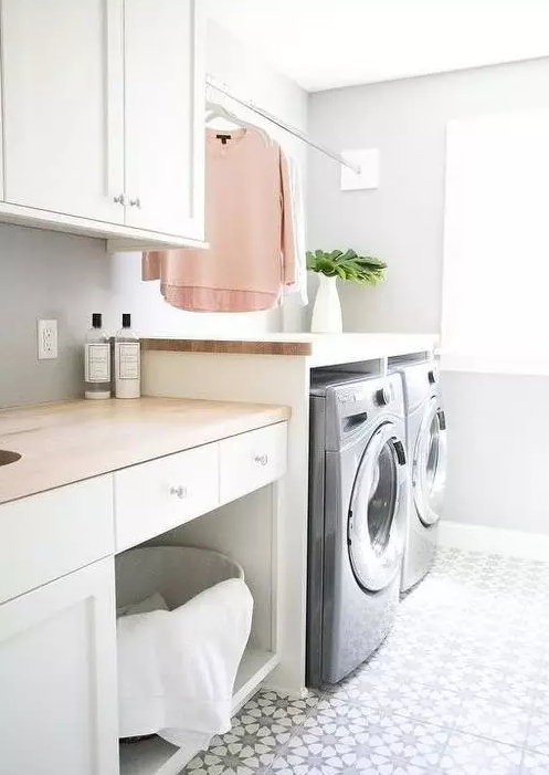 4.有个很省空间的办法是把烘干机和洗衣机摞在一起,利用垂直空间,节省占地面积。木色和白色搭配,显得干净整洁又漂亮。
