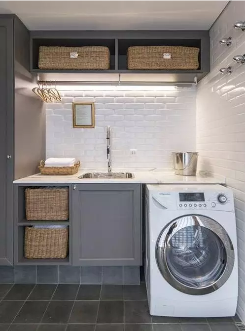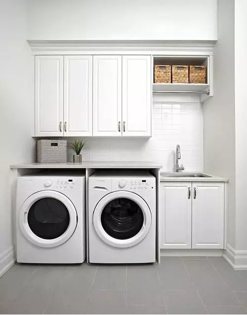 1.有些户型会存在看起来很多余空间,把洗衣房设置在这种地方是非常合适的。水槽、洗衣机、烘干机并排放,吊式柜体用于收纳,只需占用1-2平米,实用而且并不复杂。