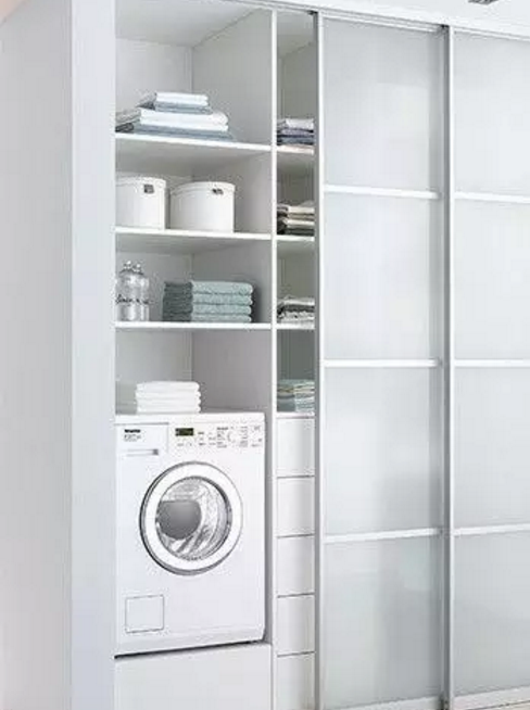 6.家里实在没有能让给洗衣房的空间,就把小型洗衣机藏进储物柜里,把移门关上以后一点儿也看不出来里面暗藏玄机。某种程度上,也算是实现了功能区的合并。