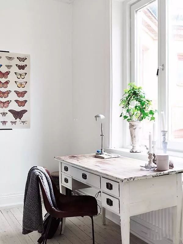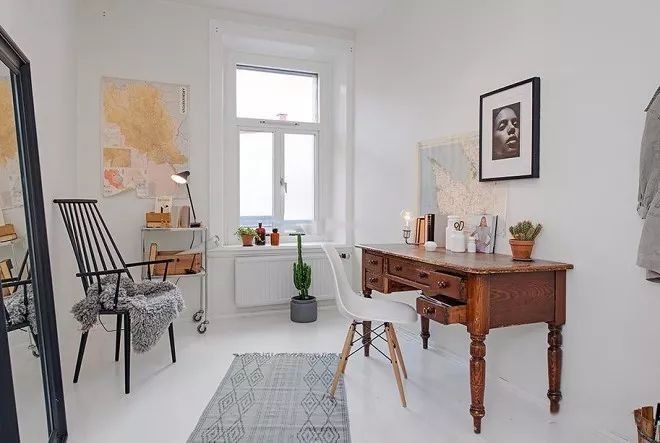 屋主有收藏老物件的习惯,看到这个桌子非常喜欢,就拜托设计师来看怎么放这好看。刚好有这么空间,搭配上一个现代椅子和现代款椅子,阳光洒落进来,读书也是很舒服呢!如果你也喜欢老物件,而且又喜欢这种风格的话,可以学着装饰一下哦