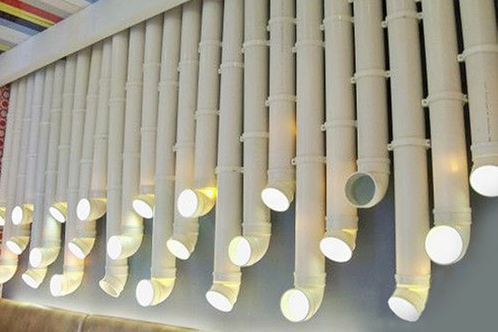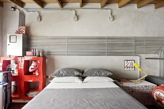 用管道来装饰墙面是比较新颖的做法,年轻一族会比较喜欢。暗灰色的金属,未经涂饰的墙面,有一种工业时代的金属感;白色的PVC管也能变成随时点亮的墙面灯。灰暗的墙面和有色的家具,组合成强烈的视觉效果。(图片来源于网络,侵删)