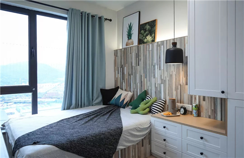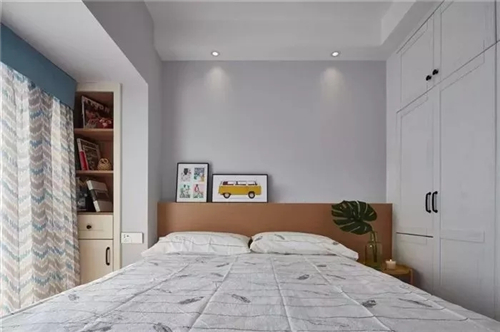 把床靠窗摆放,床头背景墙以木纹图案地板打造,床头的墙突出部分装成一道摆台,摆上装饰画也是清新又惬意。将衣柜与床头柜结合,节省了单独设计床头柜的空间。