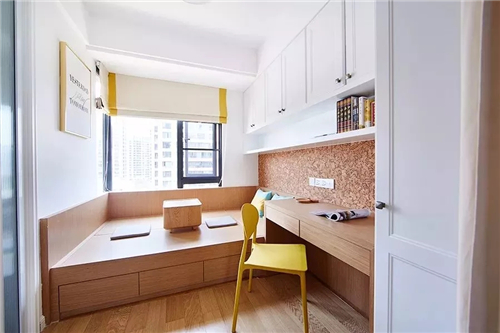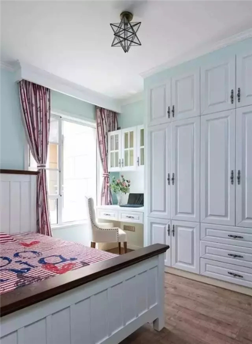 如果说卧室的衣柜只占到了墙面一半,剩余空间你会怎么利用?如果刚刚好又有一个窗户,这个时候果断选择设计一个书桌,大小很合适,采光更加好,岂不是物尽其用。