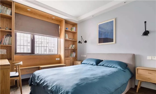 卧室飘窗柜与书柜组合,既能解决藏书问题,而且飘窗下方的收纳柜能够收纳生活中的琐碎杂物,储物能力杠杠的。