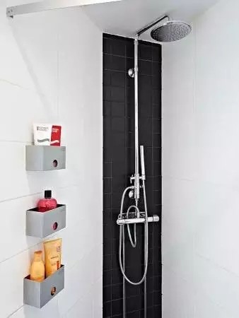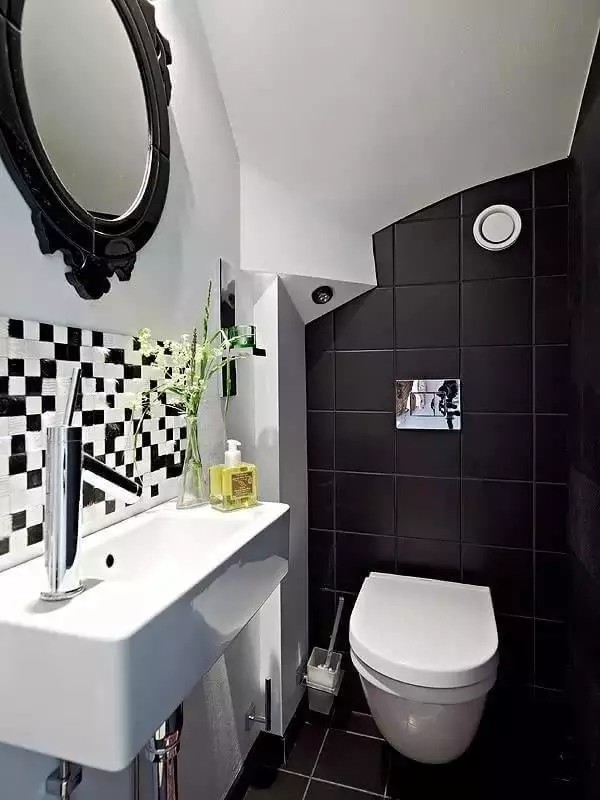 5.角形小空间,只要合理利用就不会被浪费。值得一提的是黑色瓷砖的运用,白墙中长长一条黑色,让空间有一种纵向延伸感,而且,作为淋浴器的背景墙,更突显银色五金件的光亮质感。