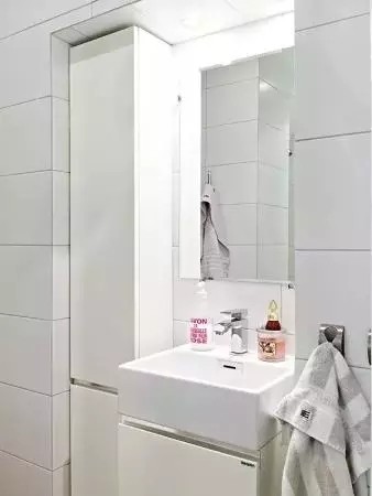 7.窄长条的收纳柜、小洗手池。因地制宜,很好的利用了这个凹陷的小空间。色彩和灯光是两大利器:如果你的卫生间很小预算也不多,那请你一定要善用色彩和灯光这两件东西。