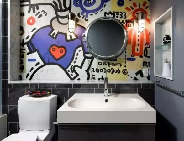3.黑色的墙,显得格外严谨低沉,如果用彩色的隔板,或者粗狂的墙画点缀,就会比较活泼欢乐,给沉闷的洗手间带来不少生气,再加上一些小盆栽,展现了一幅生机勃勃的景象。