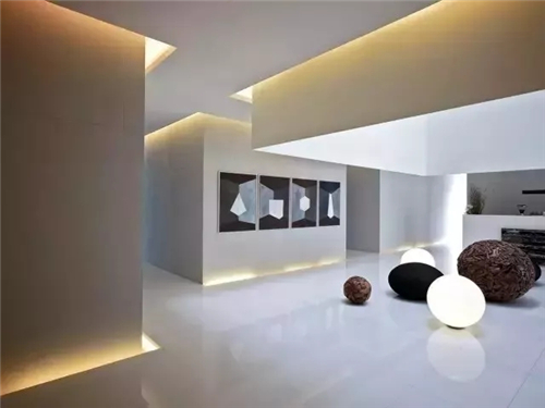如果户型里有采光不够的走廊,就可以贴着墙部底面做个灯带,让它成为一条亮起来的踢脚线,既补足了高度,又好看。