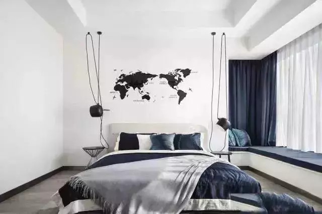 这个搭配一看就知道是很明显就是呼应了,窗帘的深蓝色与床品呼应,效果就好多了。所以如果要好看,现实生活中,最好床品和窗帘做相应的呼应,这样永远都不会出错