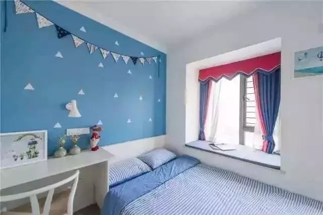 儿童房墙体蓝色壁纸,床品也是淡蓝色条纹,搭配白色的家具,窗帘用蓝色呼应,局部红色跳跃设计,打破沉闷,也显得活泼明亮