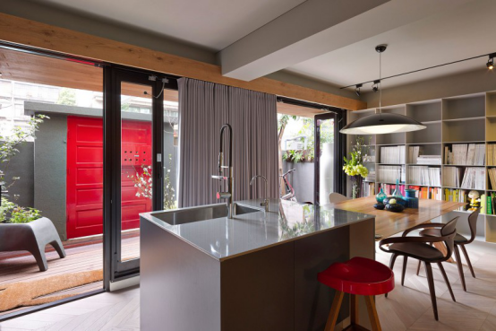 蓝色花瓶、红色座椅、浅灰色的吊灯也让家变得跳动起来了。