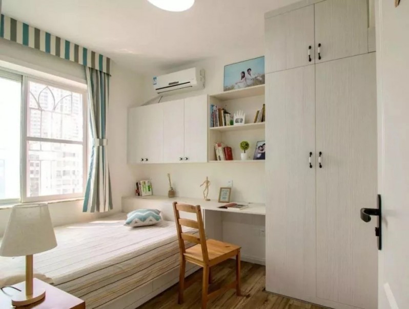 在卧室安装榻榻米,榻榻米可作为床铺休息,底部空间可用作收纳柜。榻榻米还可以与衣柜结合在一起,储物空间丰富。