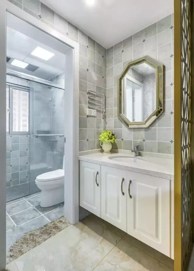 如果卫生间已经小的放不下洗漱台,那么将洗手台放至浴室外,让里面的空间不那么逼仄。