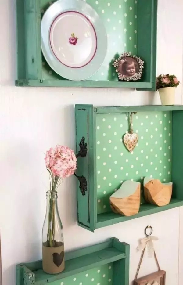 将抽屉喷上自己喜欢的颜色,安装在墙面上,摆上自己喜欢的小饰品,一个兼具美貌、独特于一身的置物架完成。