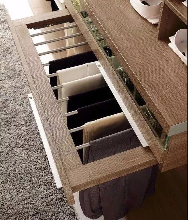 Tips:如果你是一个非常注重细节的人,还可以增设领带架或升降衣杆,把所有关于折痕的顾虑都排除在外,为自己的衣帽间再添亮点。