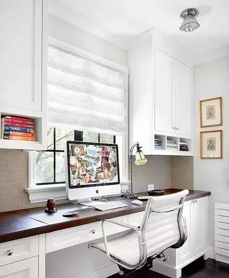 角落的空间往往被忽视,即使只有小小一块,也足够打造一片功能齐全的办公空间,最好还能拥有自然光照明和良好的通风,工作累了还可以看看窗外放松一下双眼,角落几乎看不到什么能让你分心的东西,还能更集中注意办公哦!