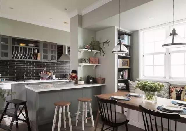 一般开放式厨房中,都会打造一个厨房吧台,在上面准备食材、备餐、用餐,这也是吧台给我们的最传统意味吧。倘若扩大厨房的操作台面积,还能增加实用的储物功能。