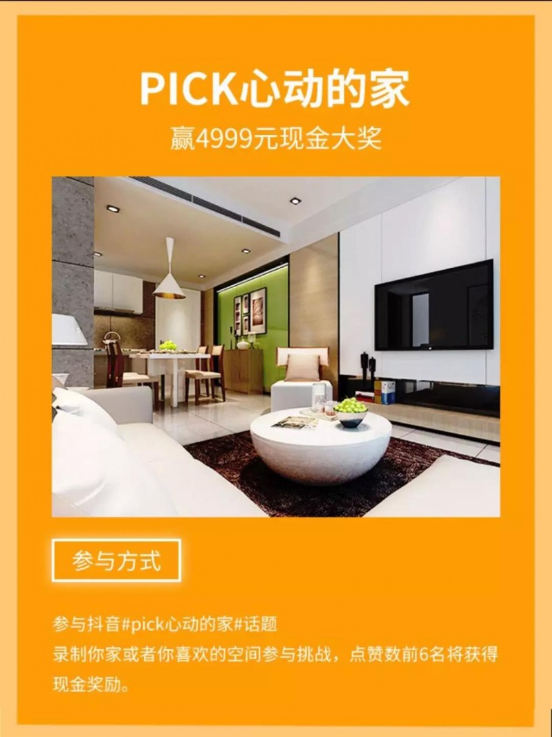 当然,除了这些丰富的店庆豪礼外,还准备了赢4999元现金大奖,参与抖音#pick心动的家#话题,录制你家或者你喜欢的空间参与挑战,点赞数前6名将获得现金奖励。