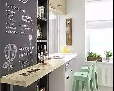△咖啡角和吧台也可以结合起来,实现空间功能的二合一,隐藏式柜体不仅方便收纳,拉上柜门还能用黑板墙做装饰。
