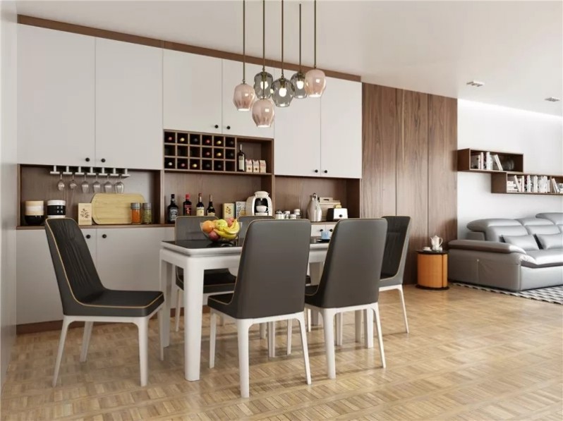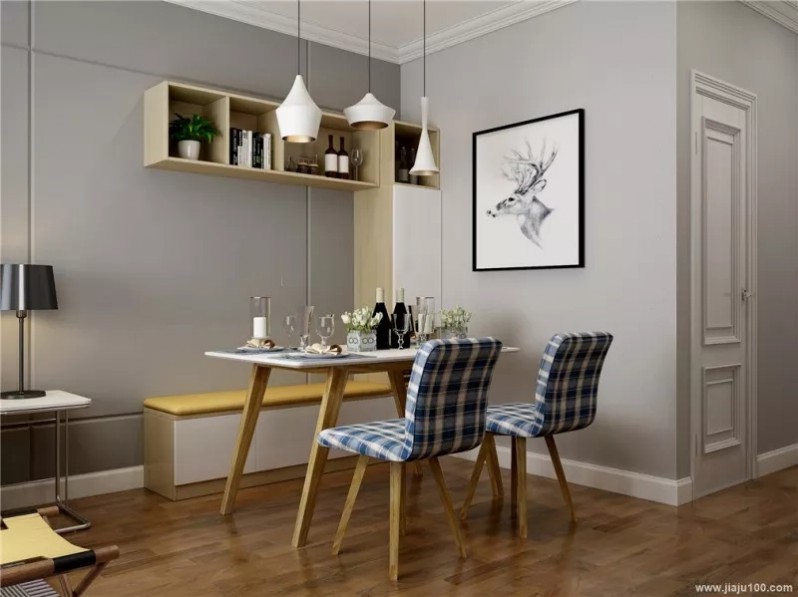 有些很小的户型,连餐厅都放不下4张餐椅,这种情况餐边柜又能派上用场了,餐边柜改变以往的形式,加上卡座的功能,不仅可以收纳,还可当做餐椅来用,一举两得,这种设计比多放置两张餐椅更省空间。