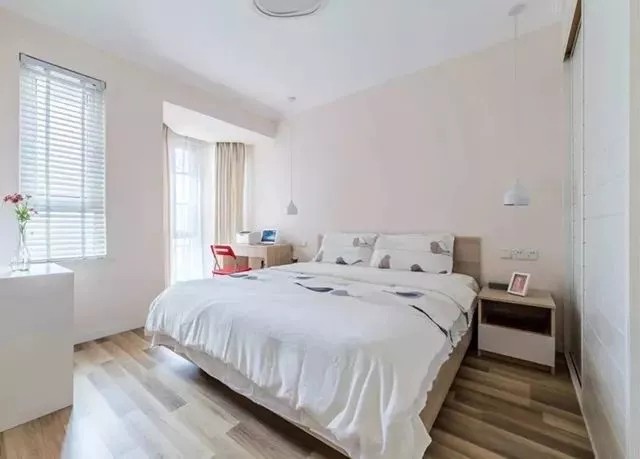 卧室在淡粉色的墙面下,用浅木色地板搭配原木质的床,装扮出一个温馨优雅而浪漫的休息空间。