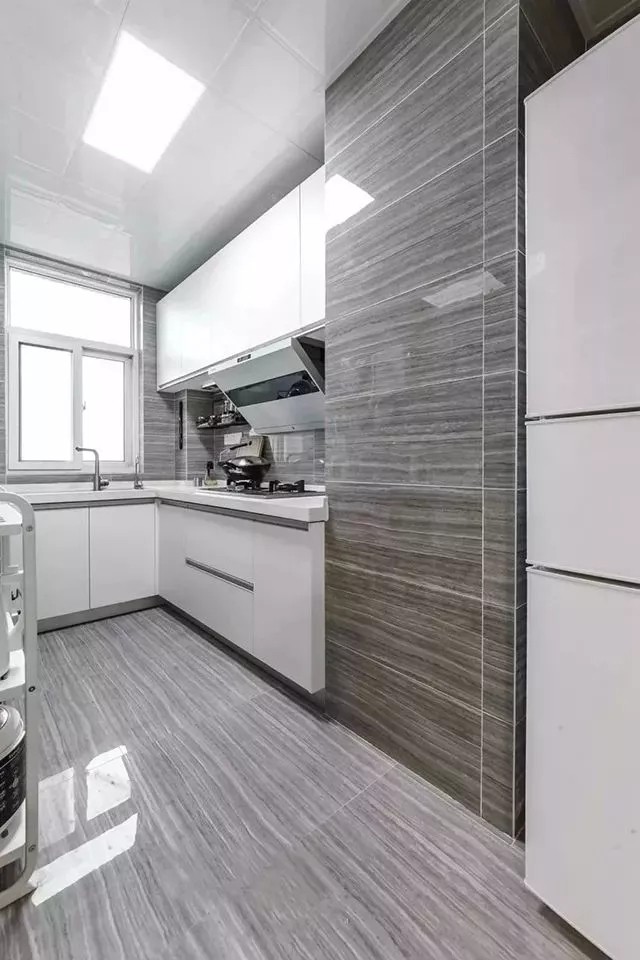 厨房墙面地面用的灰色砖,搭配上白色橱柜,还有U型的操作台,整个空间简约大方又实用,让做饭的心情松。都格外的轻松。