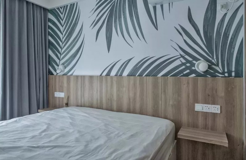 主卧木色床头延伸出对称置物台,上方铺贴绿叶墙布,两盏壁灯小巧而赋有趣味。