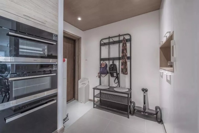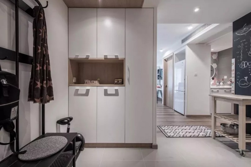 原始户型开门见厅,设计师在正对门的位置安装了一道白色储物柜,隔绝视线的同时,提高了空间的储物能力。