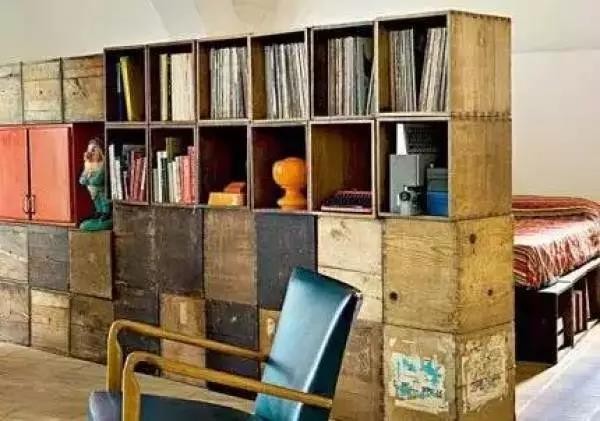 ▲ 故意打磨做旧的条板箱堆积起来,即是收纳柜,也是卧室巧妙的隔断