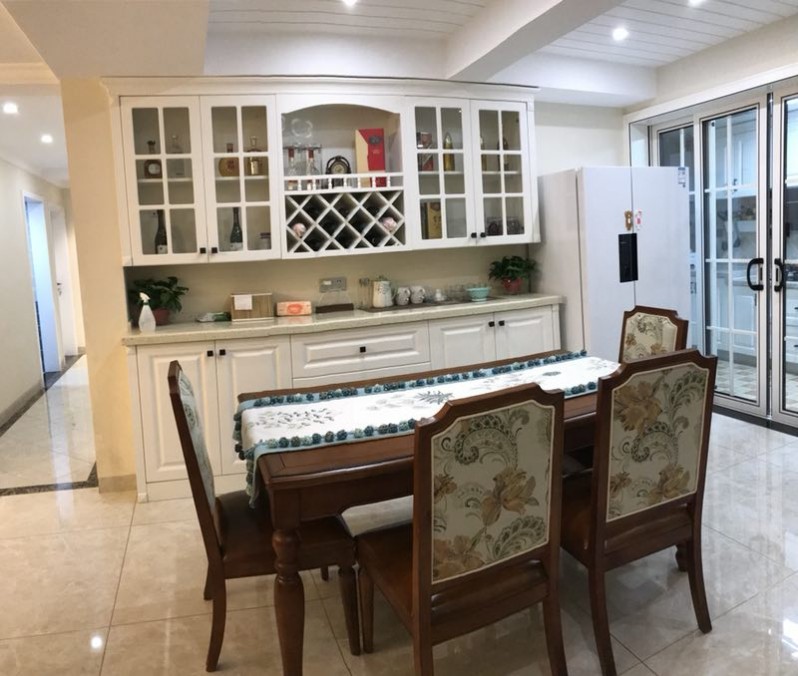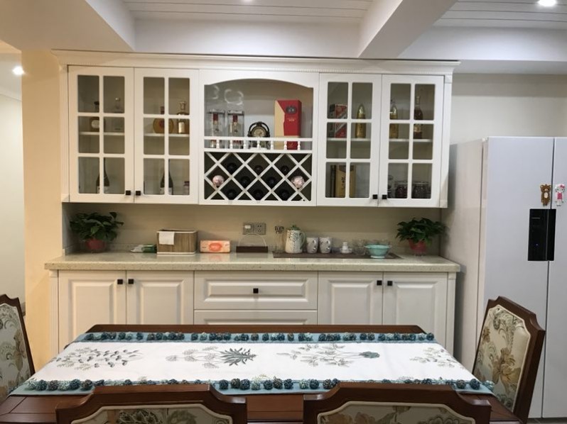 厨房空间有限,为了扩大厨房的操作空间,冰箱放在餐厅,与酒柜融为一体,功能与美观两不误。在餐厅空间允许的条件下,设置定制酒柜来容纳杨姐随时的一些东西。其中,吊柜的多种造型满足不同种类的物件摆放。