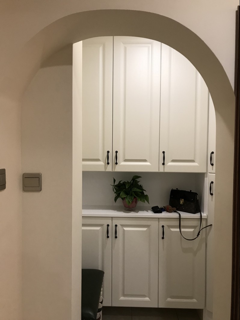 1.入户门厅比较狭窄,没有足够的空间放置鞋柜;在小区可以允许改动的情况下,设计师刘丽娟利用楼梯过道,使用小红砖堆砌隔墙,做了L型鞋帽柜,满足收纳;