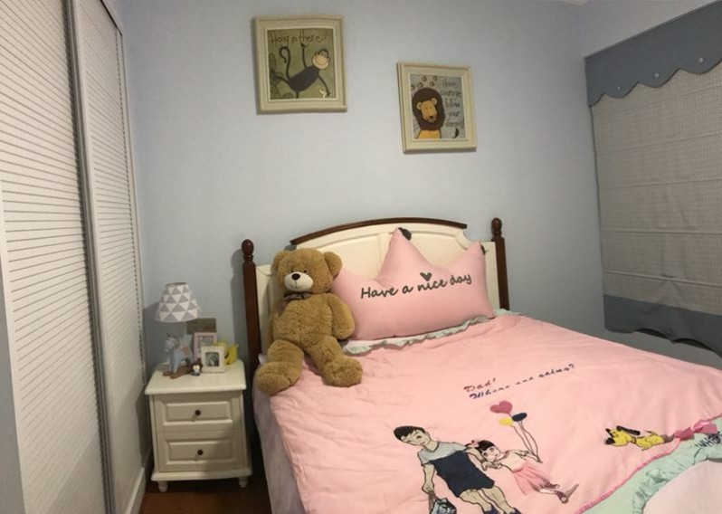 杨姐的女儿喜欢玩滑板,性格比较男孩子。在墙面颜色选择上,设计师杨丽娟选用了男女生都能接受的淡淡蓝灰色,配上白色百叶衣柜,瞬间清爽。