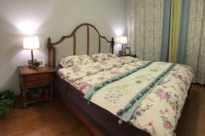 主卧以舒适度为主,淡绿色窗帘轻柔舒爽,配上花纹床品,层次感呼之欲出,优雅精致生活突显。