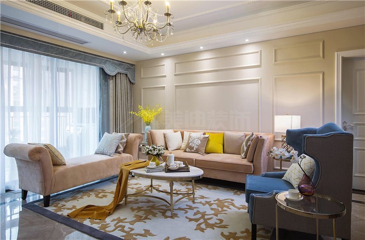 敞亮舒适的客厅空间在视觉上给人带来温馨的感觉,暖暖的氛围告别冰冷的触感,蜡烛吊灯照亮室内空间,搭配舒适软装提升居住舒适度。