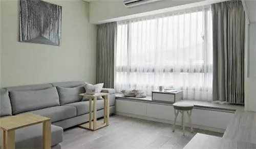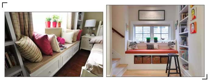 平凹的内飘窗设计由于占用了较大的室内空间,我们可以在两侧的墙面上下功夫,安排收纳柜,提高收纳机能。